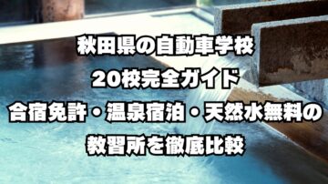 秋田県の自動車学校20校完全ガイド|合宿免許・温泉宿泊・天然水無料の教習所を徹底比較 「秋田で免許を取りたいけど、どの自動車学校を選べばいいかわからない...」と悩んでいませんか? 秋田県には20校の自動車学校があり、それぞれが独自の特色を持っています。合宿免許を実施する5校では温泉宿泊プランがあり、大曲中央自動車学校では天然水・ホットコーヒーが飲み放題、秋田モータースクールには県内唯一の大型専用…